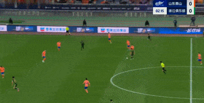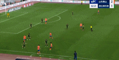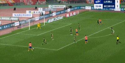 第54分钟,刘洋禁区左侧传门前,卡扎伊什维利抢点没遇到球,谢文能抢点打入球门左下角,泰山2-1反超比分。