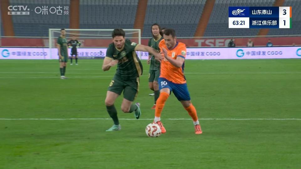 第63分钟,刘洋左路送出直塞,黄政宇脚后跟磕球,卡扎伊什维利禁区线近邻过掉卢卡斯后杀入小禁区左侧左脚推射,皮球从赵博裆下插足球门,泰山3-1当先。