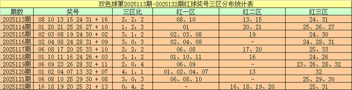 双色球第2025122期奖号为:16 18 19 20 25 31 + 13,红球三区比为0:4:2。