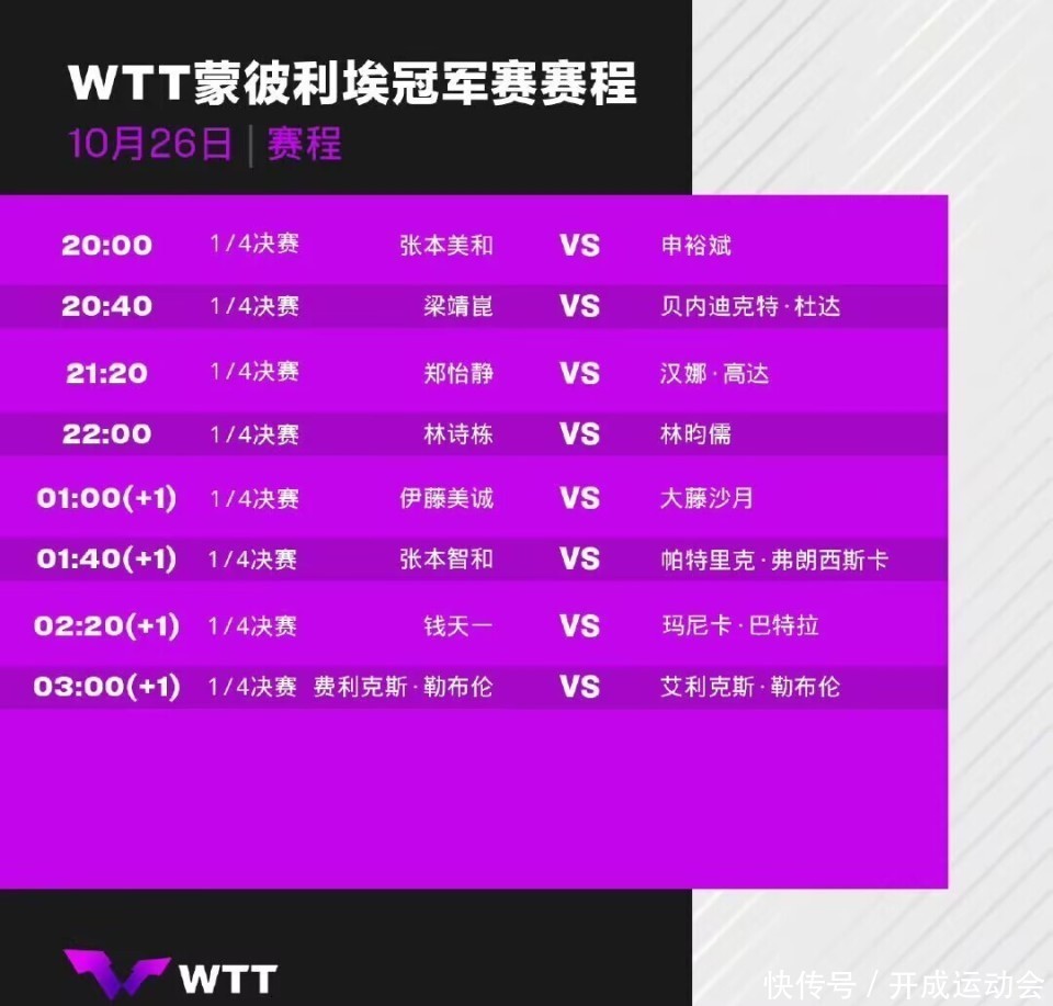 WTT冠军赛蒙彼利埃站10月26日全日赛程出炉,国乒球员能不行扛起大旗,给球迷奉献精彩比赛呢?